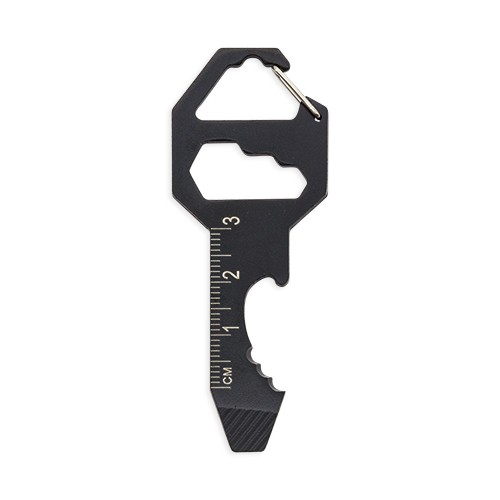 Outil multifonctionnel. Fonctions : porte-clés, décapsuleur, tournevis plat et cruciforme, cutter, règle, clé. Matières : Acero inoxidable Dimensions : 2,8 x 7,5 cm.