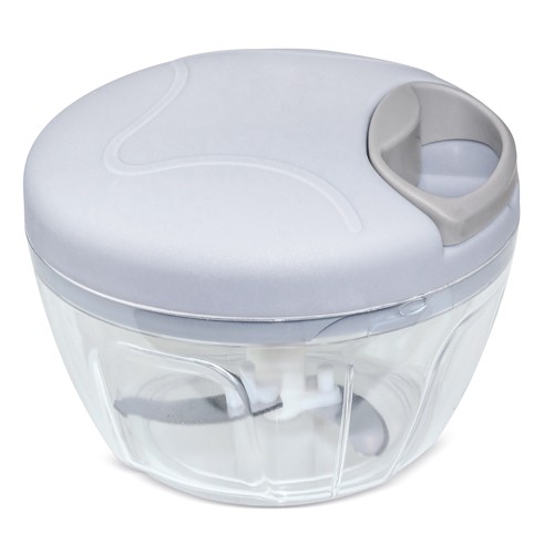 Petit hachoir manuel, fabriqué en ABS. Fonctionne en tirant et relâchant la corde qui fait tourner la lame Matières : Abs Dimensions : 13 x 9 cm.