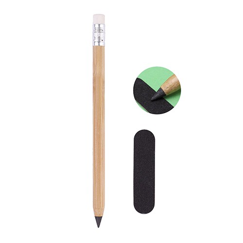 Crayon graphite avec gomme, livré dans une boîte cadeau en carton brun. La durée de vie de la mine est équivalente à celle de 100 crayons HB. Matières : Bambou, métal Dimensions : Pencil: Ø 1 x 16 cm - Box: 5,8 x 18,5 cm.