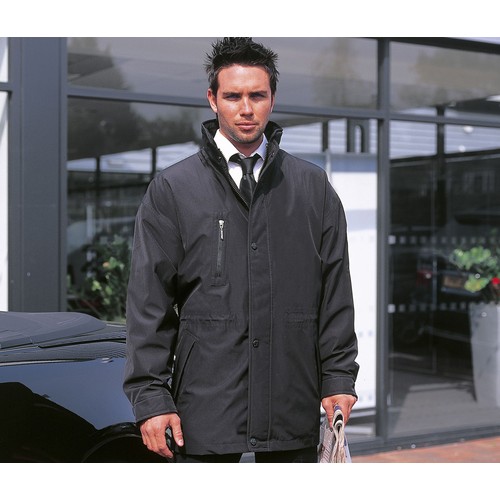 Veste de protection doublée coupe-vent et imperméable avec des coutures étanchées. Fermeture éclair sur toute la longueur jusqu'au col, protégée par une patte de boutonnage avec boutons pressions cachés. Deux poches poitrine, deux avec rabat et fermeture auto-agrippante et deux avec fermeture à glissière imperméable. Boucle pour carte d'identité sur le côté gauche. Poches latérales avec fermeture à glissière et doublure en polaire. Trois poches intérieures spacieuses, deux avec fermeture à glissière. Capuche ajustable avec cordon de serrage, détachable. Poignets auto-agrippant réglables et taille ajustable avec cordon de serrage. La doublure peut être ouverte pour faciliter l'impression et la broderie. Matière : 100% polyester