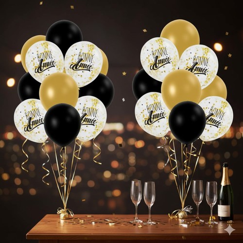 12 ballons 30 cm 3 Bonne Année 3 Or, 3 Noir, 3 confettis Or