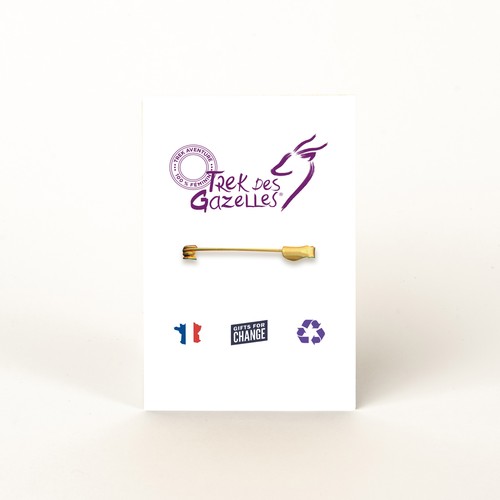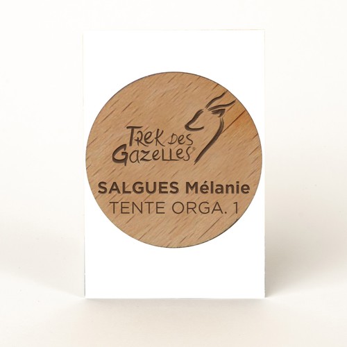 RDT2100334Badge en bois diamètre 50mm, attache broche laiton, monté sur une carte. Le badge et la carte sont personnalisables.