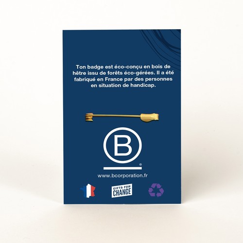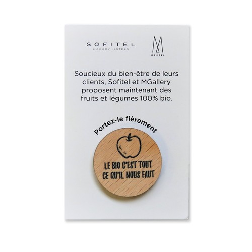 RDT2100340Badge en bois diamètre 30mm, attache broche laiton, monté sur une carte. Le badge et la carte sont personnalisables.