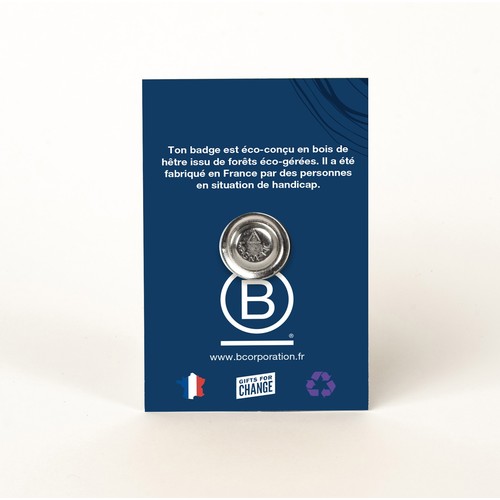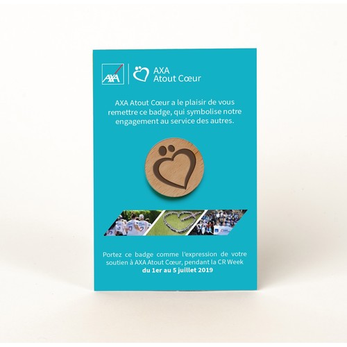 RDT2100345Badge en bois diamètre 20mm, avec aimant, monté sur une carte. Le badge et la carte sont personnalisables.