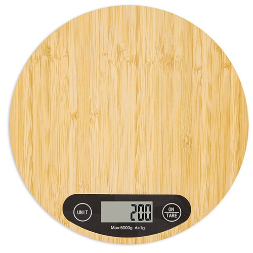 RDT2695903Balance de cuisine digitale en bambou. Batteries à bouton incluses. Emballage individuel couleur havane. Matières : Bambou