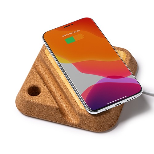 RDT2797691Base de chargement sans fil 10W, en bambou et liège. Peut être utilisé comme support pour smartphone et équipé d'un trou pour porte-stylo. Compatible avec les appareils équipés de la technologie sans fil. Câble de type C intégré. Livré dans un packaging éco-conçu. Matières : Bambú/corcho