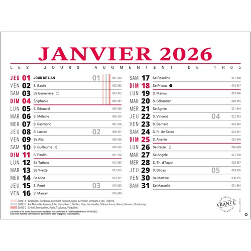 RDT1867103Support : 12 feuillets papier offset 70 g Grille : mensuelle - langue : français - fêtes - n° semaine - lunaisons - quantièmes - congés scolaires