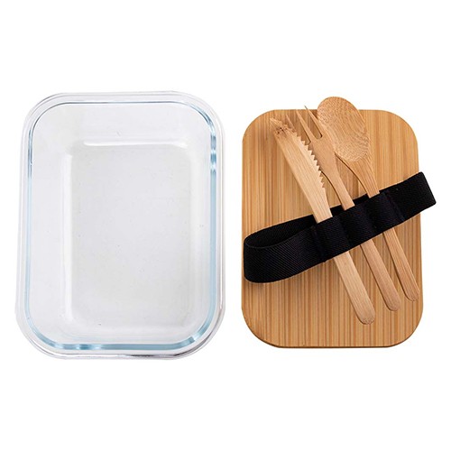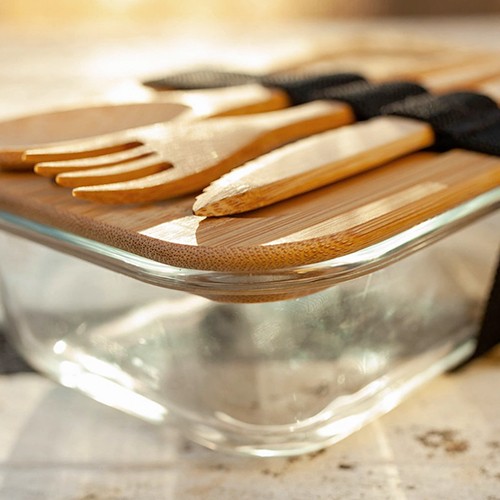 RDT2086511Gamelle 700 ml en verre, avec couvercle hermétique, bande en caoutchouc pour empêcher le déversement et coupe à utiliser comme plateau. Elle comprend un ruban adhésif de sécurité avec fourchette, cuillère et couteau. Présentée dans une boîte individuelle de design écologique Matières : Verre, Bambou