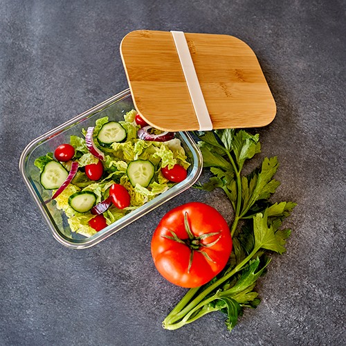RDT2086113Gamelle en verre avec couvercle en bambou et bande de fermeture en silicone. Présentée dans une jolie boîte écologique. 900 ml Matières : Verre, Bambou