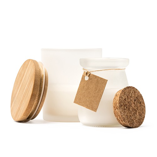 RDT2083454Bougie parfumée en verre avec couvercle. Parfum vanille Livré avec une carte kraft pour la personnalisation. Présenté dans une boîte unique avec un design écologique. Matières : Verre, Cire