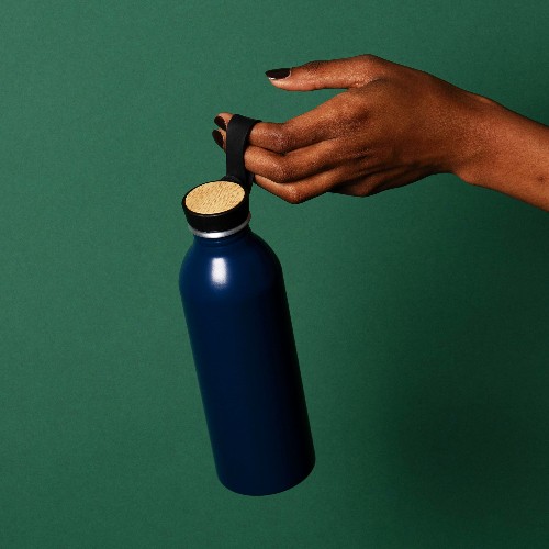RDT3017210Bouteille en aluminium recyclé à paroi simple, avec bouchon à vis avec insert en bois et pratique dragonne pour le transport. Capacité de 550ml. Matières : Aluminium recyclé
