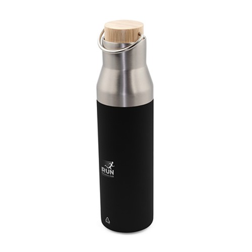 RDT3067630Bouteille thermos 550 ml, double paroi en acier inoxydable avec isolation sous vide qui ralentit la diffusion de la température dans l'environnement, fonctionnant comme un thermos, couvercle avec détail en bambou et poignée en métal pour faciliter le transport, matériaux du produit incluant de l'acier inoxydable recyclé, maintient la température des boissons chaudes jusqu’à 20 heures + étanche