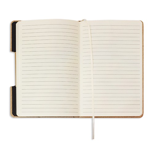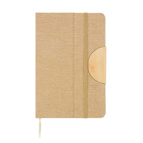 RDT2879637Carnet A5 avec couverture rigide en RPET avec insert en bambou, peut être utilisé comme support pour smartphone. Doté d'un élastique de fermeture et d'un marque-page. 25 feuilles de Matières : RPET, bambou