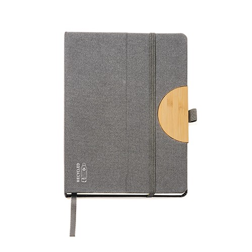RDT2081505Carnet de notes A5 à couverture rigide en RPET avec fonction support pour appareils mobiles. Fermeture élastique, marqueur de page et passant pour stylo. 80 feuilles lisses de couleur crème. Matières : RPET