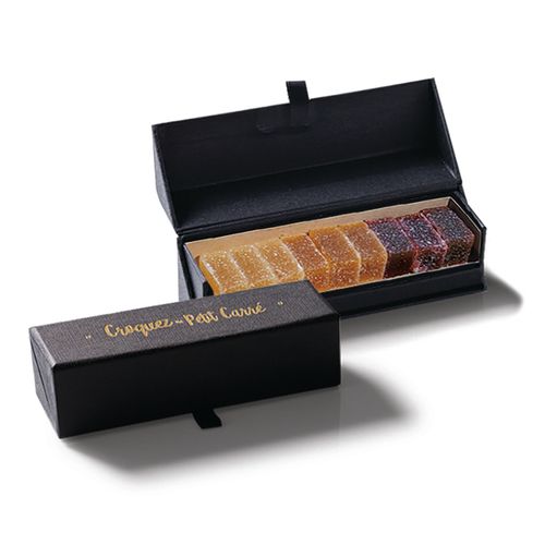 RDT3209142Coffret en carton recyclé recouvert d'un papier texturé et doré à chaud contenant des pâtes de fruits produites à partir de fruits rigoureusement sélectionnés issus de vergers français (sauf fruit de la passion), sans colorant ni arôme artificiel.