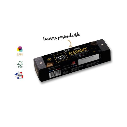RDT1341511Coffret Elégance personnalisé avec 16 carrés de 5g : 4 carrés de 42%, 4 carrés Gianduja, 4 carrés 68%, 4 carrés 75%.