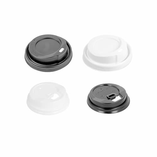 RDT2517998Couvercle en PLA biodégradable pour les gobelets carton. En translucide, blanc ou noir. Non personnalisable. Pour les gobelets d'un diamètre de 6, 8 et 9 cm.