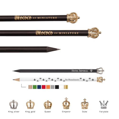 RDT2032182Crayon à papier de qualité avec embout en forme de couronne, au choix parmi 6 modèles. Corps rond en bois de tilleul noir ou naturel certifié FSC - Mine graphite HB. Finition laquée coloris au choix. Fabrication Europe
