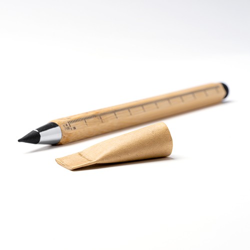 RDT2797530Crayon perpétuel multifonctionnel avec corps en bambou. Pointe graphite interchangeable, pour une écriture infinie. Bouchon en carton. Fonctions : règle et pointeur à écran tactile. Matières : Bambú