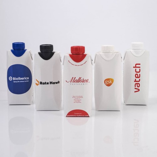 Eau en carton personnalisée. Bouchon noir. Impression directe. 1 couleur