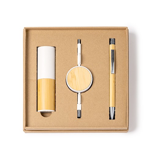 RDT3017784Ensemble cadeau comprenant : une batterie externe de 5000mAh en bambou et ABS recyclé, avec port d'entrée USB et sortie type-c , un câble de chargement extensible de 85cm en ABS recyclé avec insert central en bambou, port d'entrée type-c et USB, sortie type-c et lightning , un stylo en bambou avec mécanisme à clic, encre bleue. Le tout est présenté dans un emballage au design écologique. Matières : Bambou, ABS recyclé