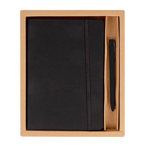 RDT3119060Ensemble de bureau comprenant : un carnet avec couverture rigide en PU recyclé, 96 feuilles lignées, fermeture élastique , un stylo à bille avec corps en aluminium recyclé et finition mate Livré dans un emballage en carton.