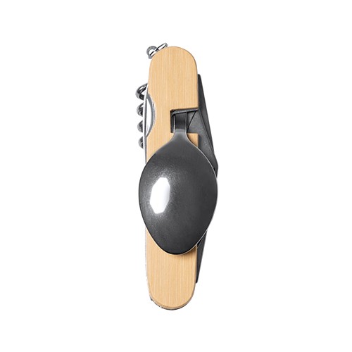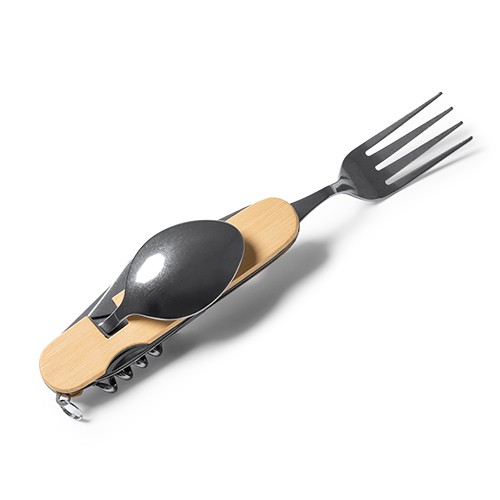 RDT2879389Set de couverts polyvalents en acier inoxydable avec corps en bambou. Fourchette avec fonction tire-bouchon et cuillère avec couteau. Fourni dans un emballage au design écolog Matières : Acier inoxydable/bambou