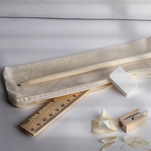 RDT2085292Set composé par un étui en coton, un crayon en bois naturel, un taille-crayon en bois, une gomme et une règle de 15cm. Matières : Coton, Bois