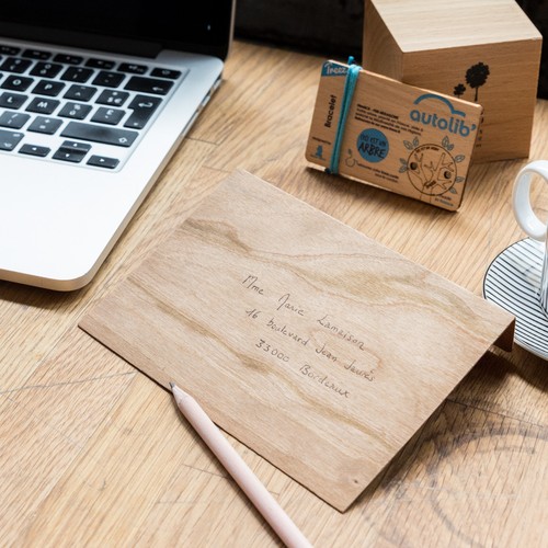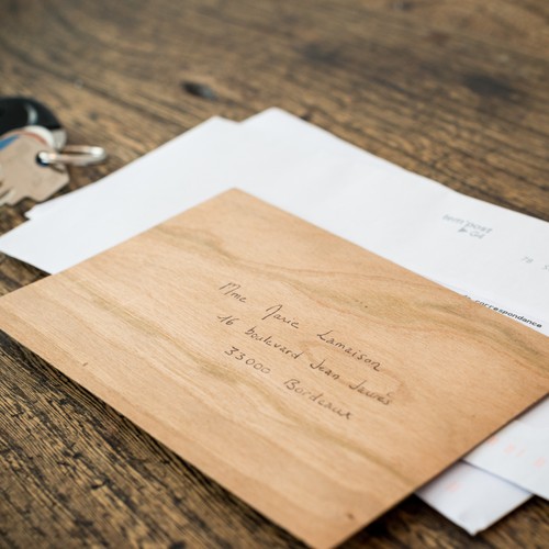 RDT2100322Enveloppe en bois format recangulaire 148*98mm pour des correspondances et invitations haut de gamme. Ecriture au stylo à bille traditionnel, ne dépasse pas 20 grammes (timbre normal même en combinant cette enveloppe avec une de nos cartes en bois).