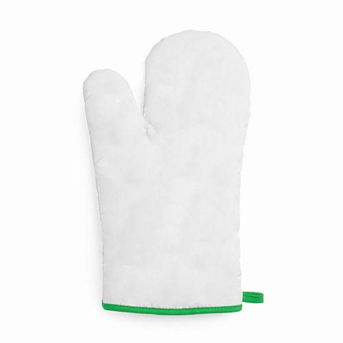 RDT2082829Guant de cuisine 100% polyester souple avec une délicate finition blanche et bords colorés. Un coté lisse expressement pensé pour la sublimation. Avec accroche. Matières : Polyester