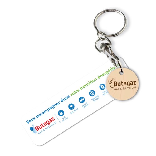RDT2100312Jeton de caddie écologique en bois monté sur mousqueton et anneau porte-clés, avec carte en papier recyclé.