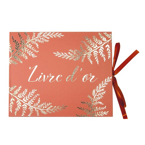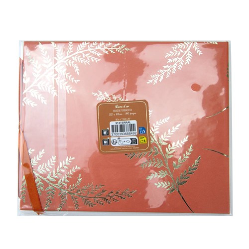 RDT3343797LIVRE D'OR FOUGÈRE TERRACOTTA ET OR AVEC RUBANS ASSORTIS POUR LE FERMER. DIMENSIONS: 22X18CM - 80 PAGES - 40 FEUILLES DE PAPIER BLANC 150 GRAMMES.