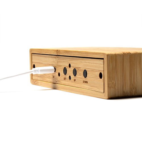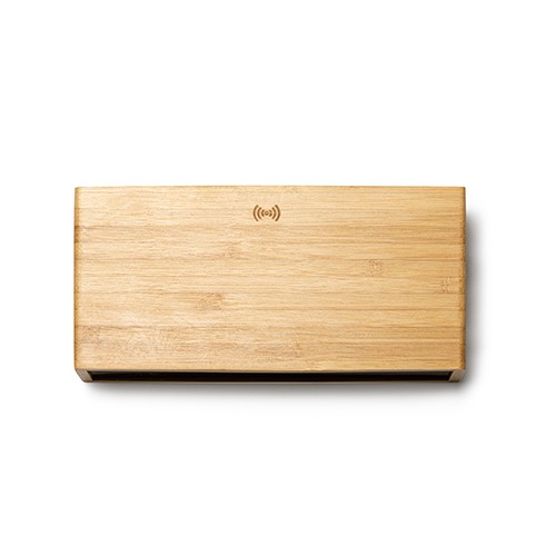 RDT2081781Horloge de table en bambou, avec chargeur sans fil 5W intégré. Fonctionnalité : heure, date, alarme et température. Connexion de type C. Câble inclus. Livré en pack individuel éco-conçu. Matières : bambou