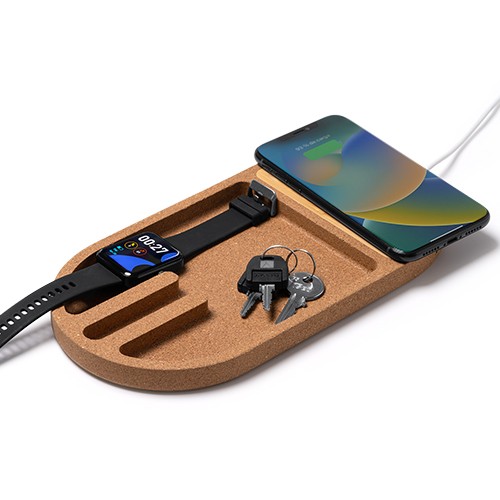 RDT2797558Organisateur de bureau en bambou et liège, avec chargeur sans fil 10W intégré. Compatible avec les appareils équipés de la technologie sans fil. Câble de type C inclus. Livré dans un packaging éco-conçu. Matières : Bambú/corcho