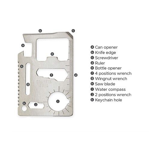 RDT2085524Outil multifonction en acier inox avec 11 fonctions. Ouvre-boîtes, cutter, tournevis, règle, décapsuleur, clé-anglaise, clé à papillon, scie à métaux et indicateur de direction. Emballé dans une boîte en similcuir. Matières : Acier inoxydable