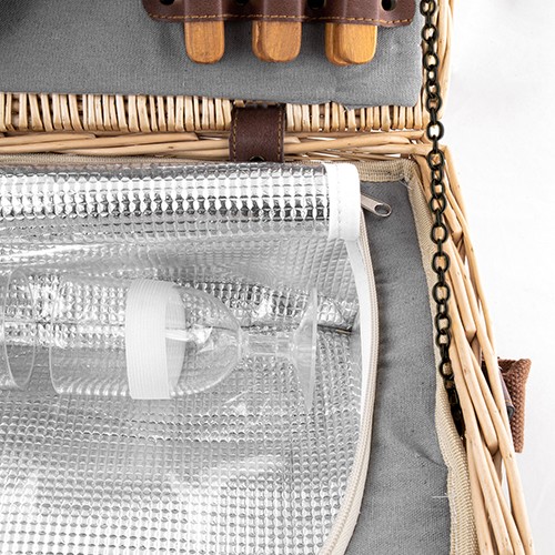 RDT2081460Panier de pique-nique en osier avec accessoires pour 2 personnes et compartiment réfrigérant. Tous les accessoires sont correctement placés et ordonnés à l'intérieur grâce à leurs crochets. Matières : Osier, Bois, Acier inoxydable, Céramique, Verre, PP, Polyester