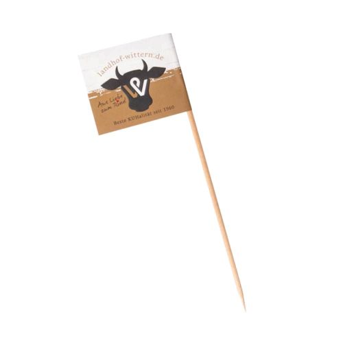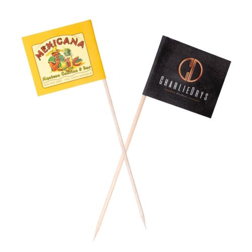 RDT2032290Petit drapeau 50x40mm collé autour d'un pique en bois de 150mm de long - Papier couché brillant 135 g/m² imprimé recto/verso. Chaîne de production automatisée selon les normes d'hygiène en vigueur pour les produits destinés au contact alimentaire.