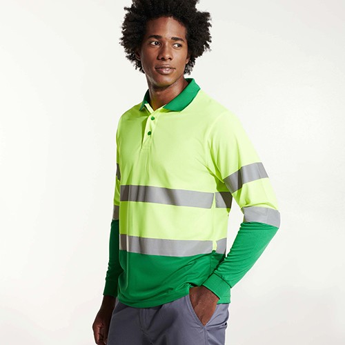 RDT2089004Polo technique manches longue haute visibilité avec deux bandes refléchissantes sur manches, poitrine et dos Patte de boutonnage 3 boutons