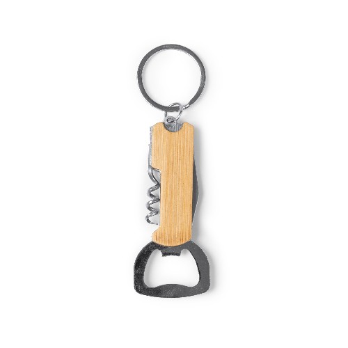RDT3111129Porte-clés ouvre-bouteille avec couteau et tire-bouchon, corps en bambou. Matières : Bambou