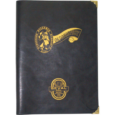 RDT2450873Porte menu en cuir pleine fleur avec angles nickelés ou laitonnés. Contient 10 pages cousues - 23x32 cm fermé MARQUAGE inclus : à chaud ou en sérigraphie 1C