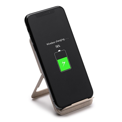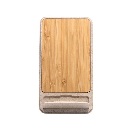 RDT2797693Support pour smartphone avec chargeur sans fil intégré de 15 W, en bambou et fibre de blé. Posez simplement votre smartphone pour le recharger. Compatible avec les appareils équipés de la technologie sans fil. Câble de type C inclus. Livré dans un packaging éco-conçu. Matières : Bambú/fibra de trigo