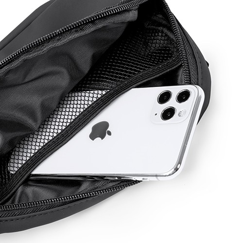 RDT3017811Sac banane en PU. Deux compartiments avec fermeture à glissière. Poche intérieure en filet. Sangle réglable. Matières : PU