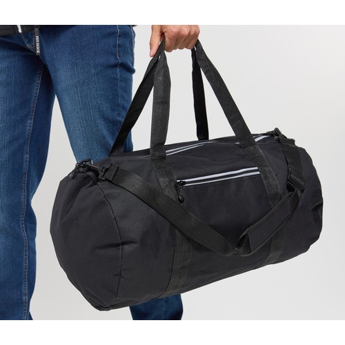 RDT3295938Sac de voyage et de sport de 30 litres. Forme tubulaire. Compartiment central et poche avant zippée. 2 anses et bandoulière amovible. Fermeture par zip contrasté. Surfaces d'impression : devant : 12x12cm et côtés : 14x14cm.
