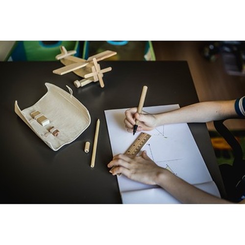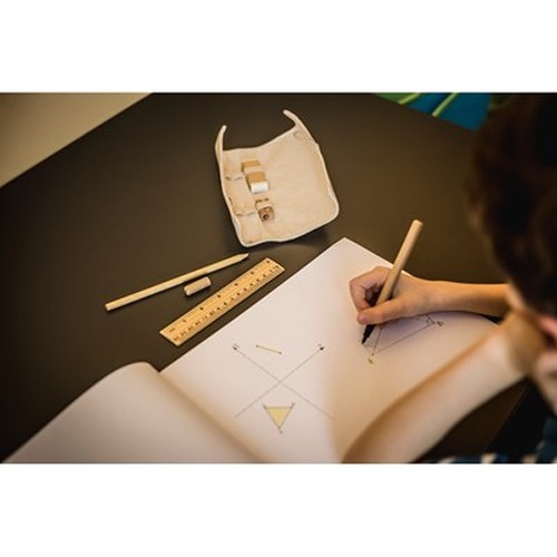 RDT1859806Set d'école dans une pochette en coton avec règle, crayon, stylo bille, gomme et taille-crayon