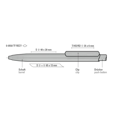 RDT3319528Stylo bille rétractable avec corps transparent givré, clip et poussoir en plastique ABS recyclé Zone de préhension intégrée.