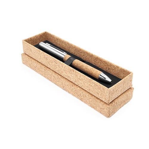 RDT2085708Élegant stylo métallique avec finition chromée et corp en liège. Présenté dans un étui en liège. Encre bleue métallique Matières : Stylo : Liège, métal ; Boîte : Carton, Liège