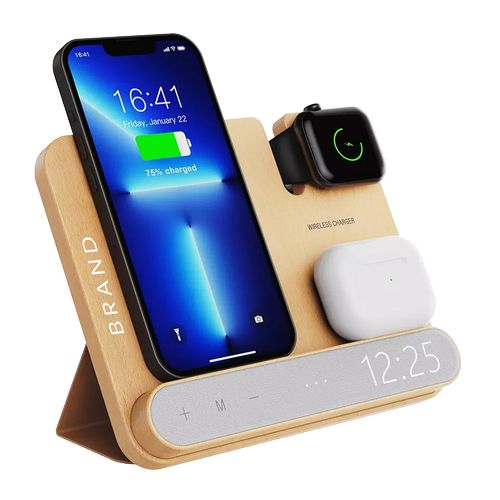 RDT2680267Support de charge 4 en 1 à induction et réveil . Support pliable. Permet de recharger un smartphone, une montre connectée et des airpods.