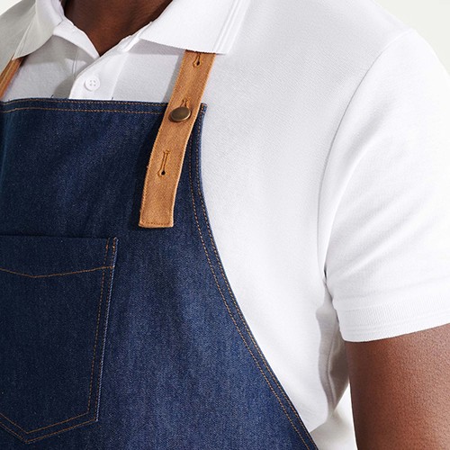 RDT2086513Tablier de cuisine effet denim. Grandes poches avant. Bandoulière réglable. Matières : 100% Coton - 250gr/m2