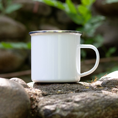 RDT2086580Tasse rétro en métal 370ml avec des petites imperfections pour accentuer l'effet rétro. Réalisée pour le marquage en sublimation, avec bord chromé. Emballée dans une boîte individuelle. Matières : Métal
