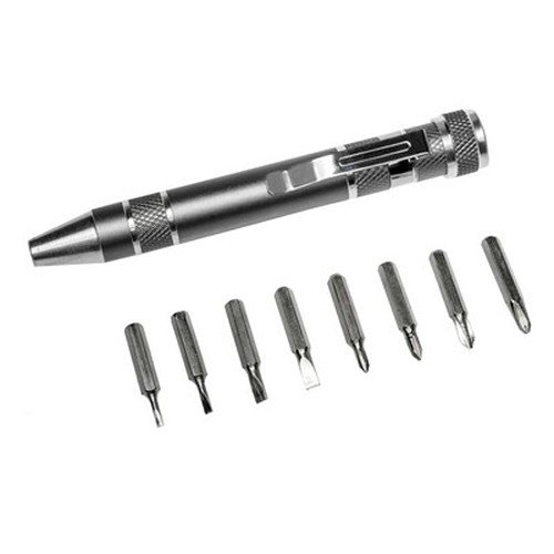 RDT1858030Tournevis en forme de stylo avec 4 pointes plates et 4 pointes cruciformes, doté d'un clip pour l'épinglage, produit en aluminium et en acier